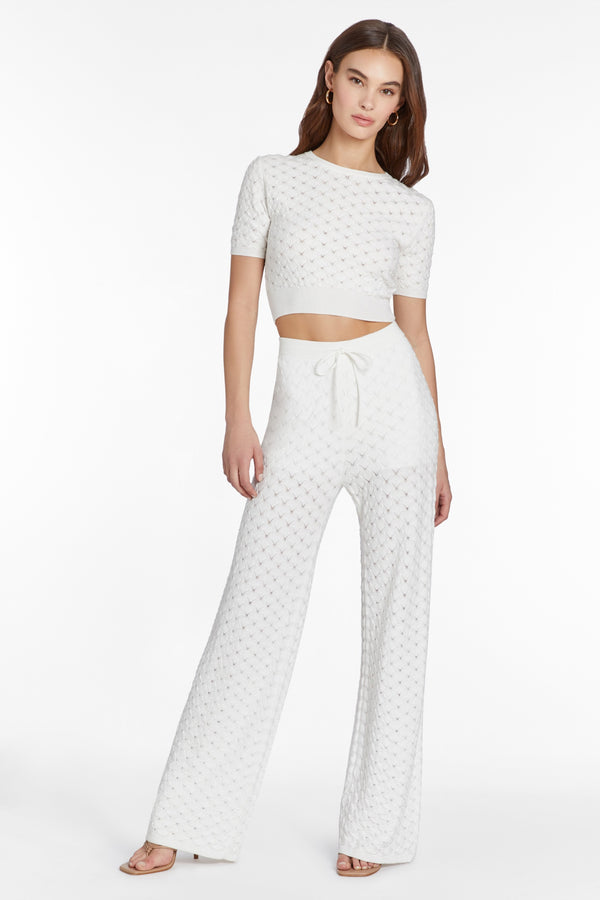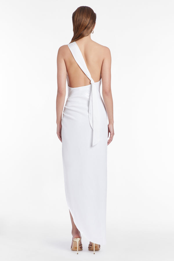 Woman wearing a white dress with ruffled sleeves on a white background view 2