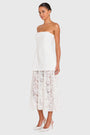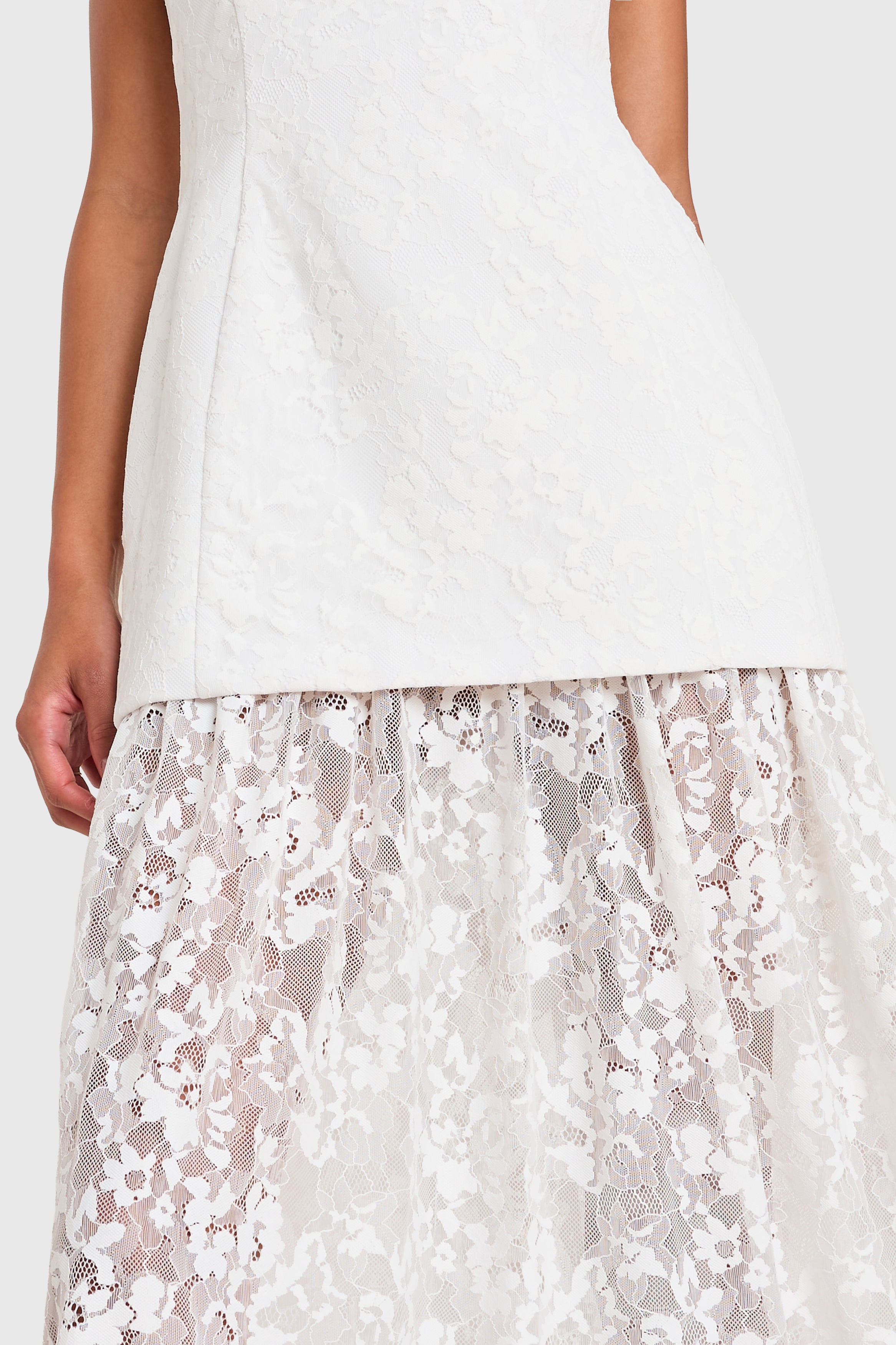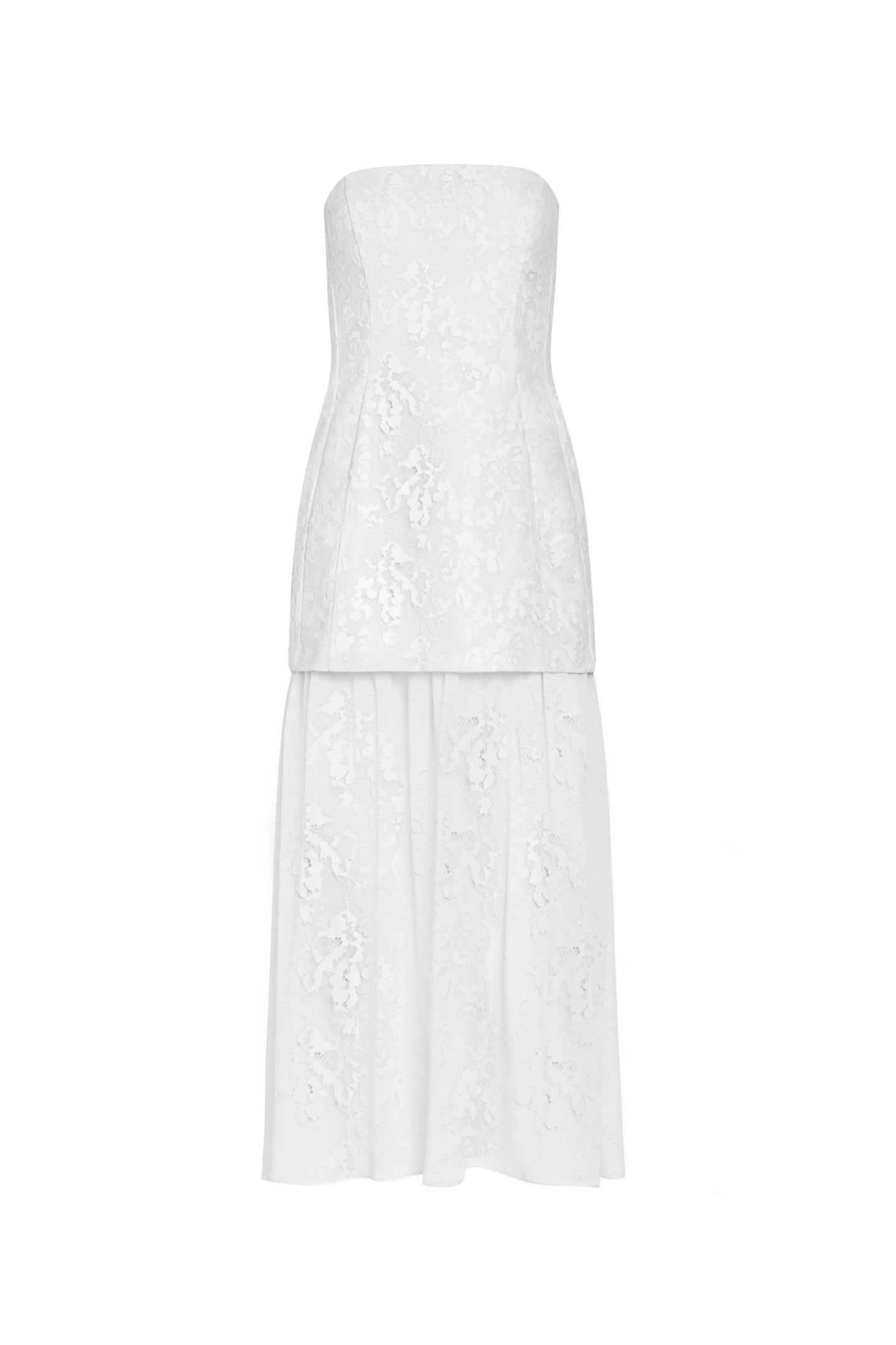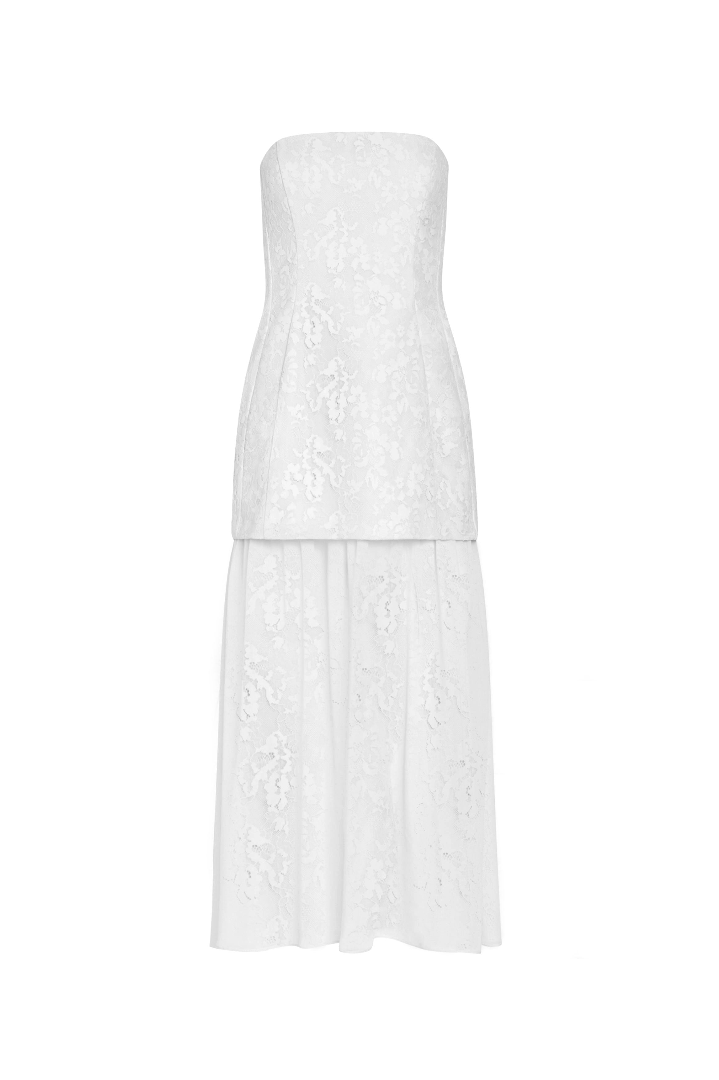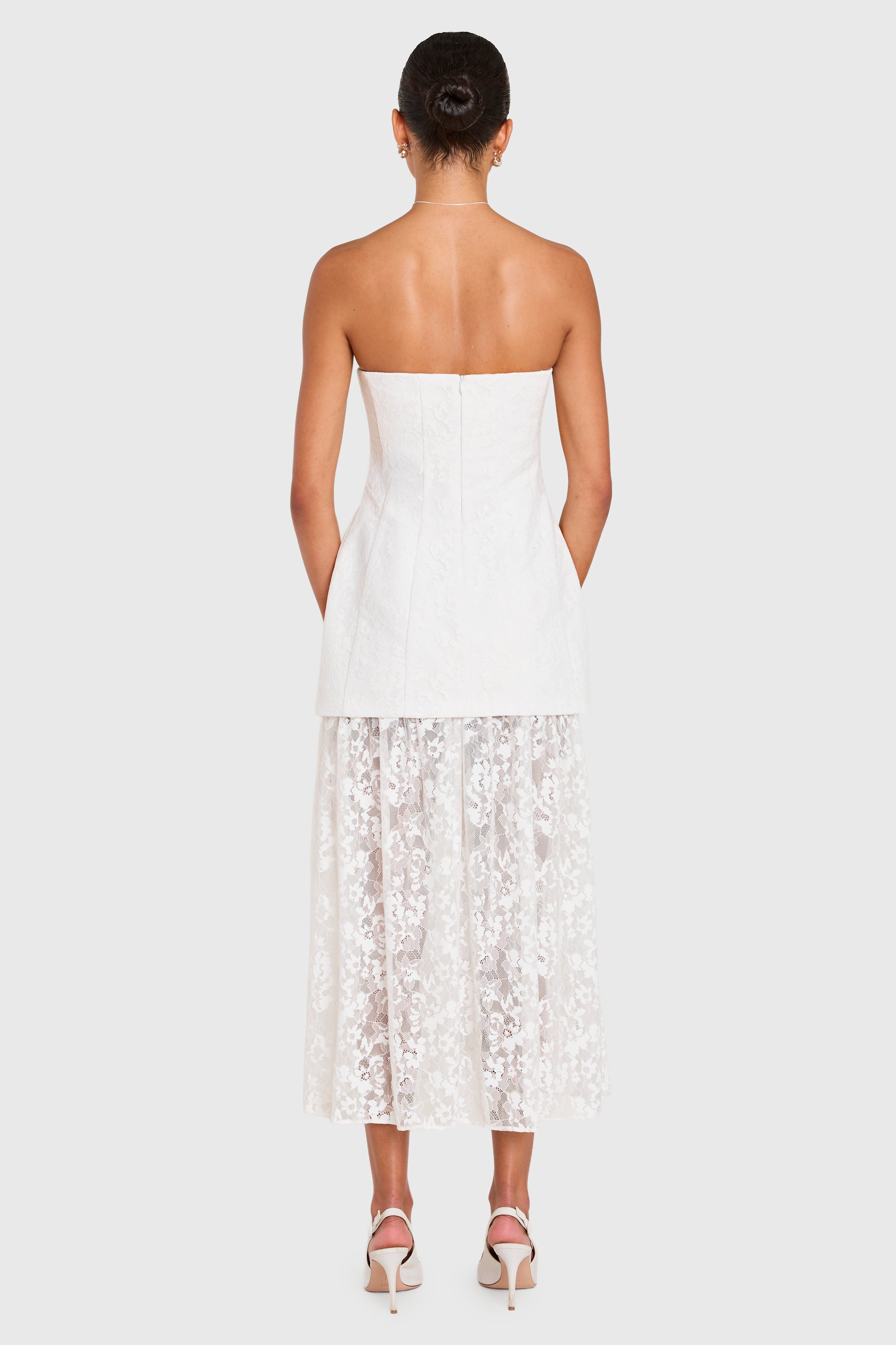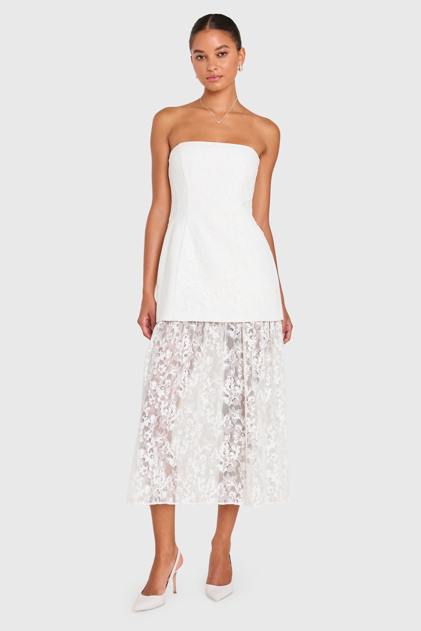 The Linda Midi Dress gives the illusion of a midi-maxi hemline, with a sheer layer of lace draped over a formfitting strapless dress.