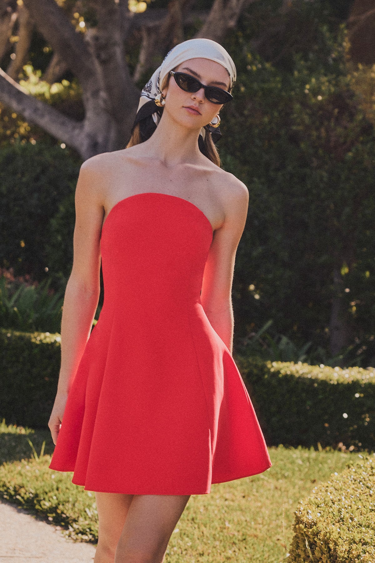 Make an entrance in the Romilly Dress. Featuring a rounded strapless neckline and a skirt with just the right amount of volume, this dress is designed to turn heads. Pair it with pointed heels and statement earrings for a standout finish.