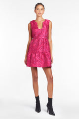 Woman wearing a brown and black zebra print dress on a white background view 2