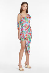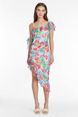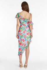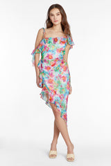 Woman wearing a brown and black zebra print dress on a white background view 2