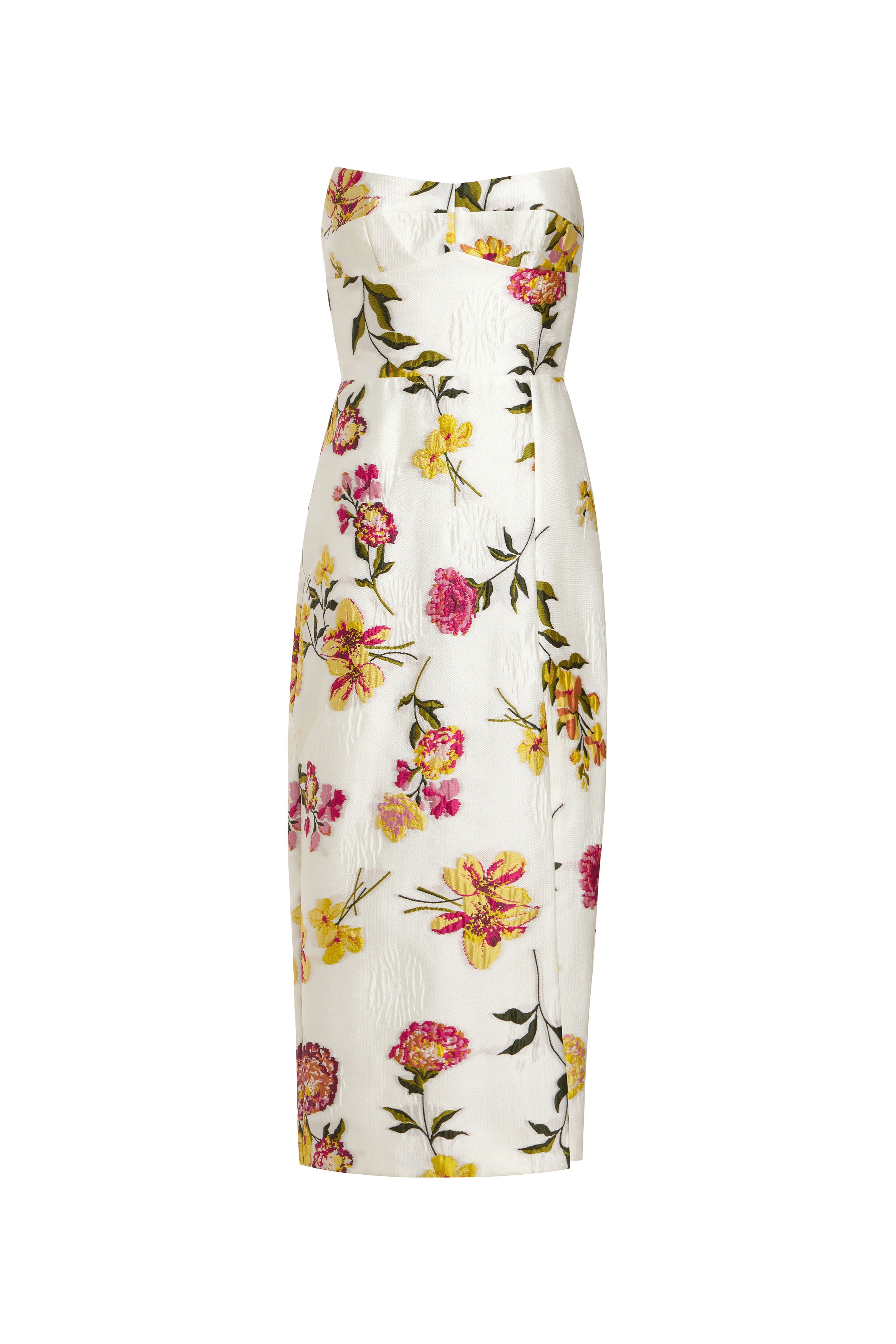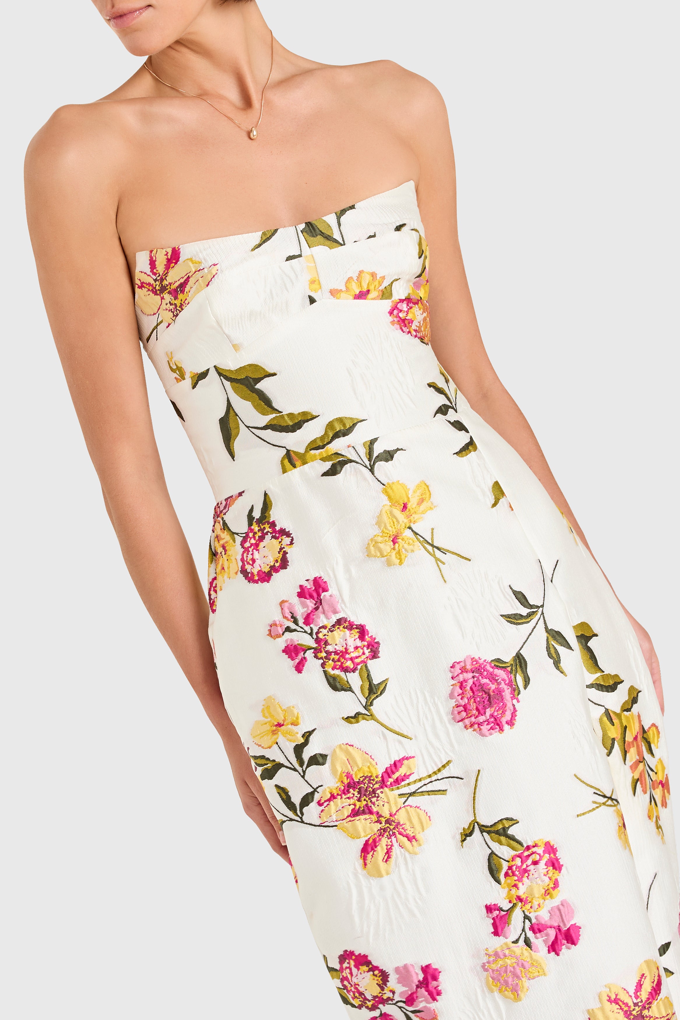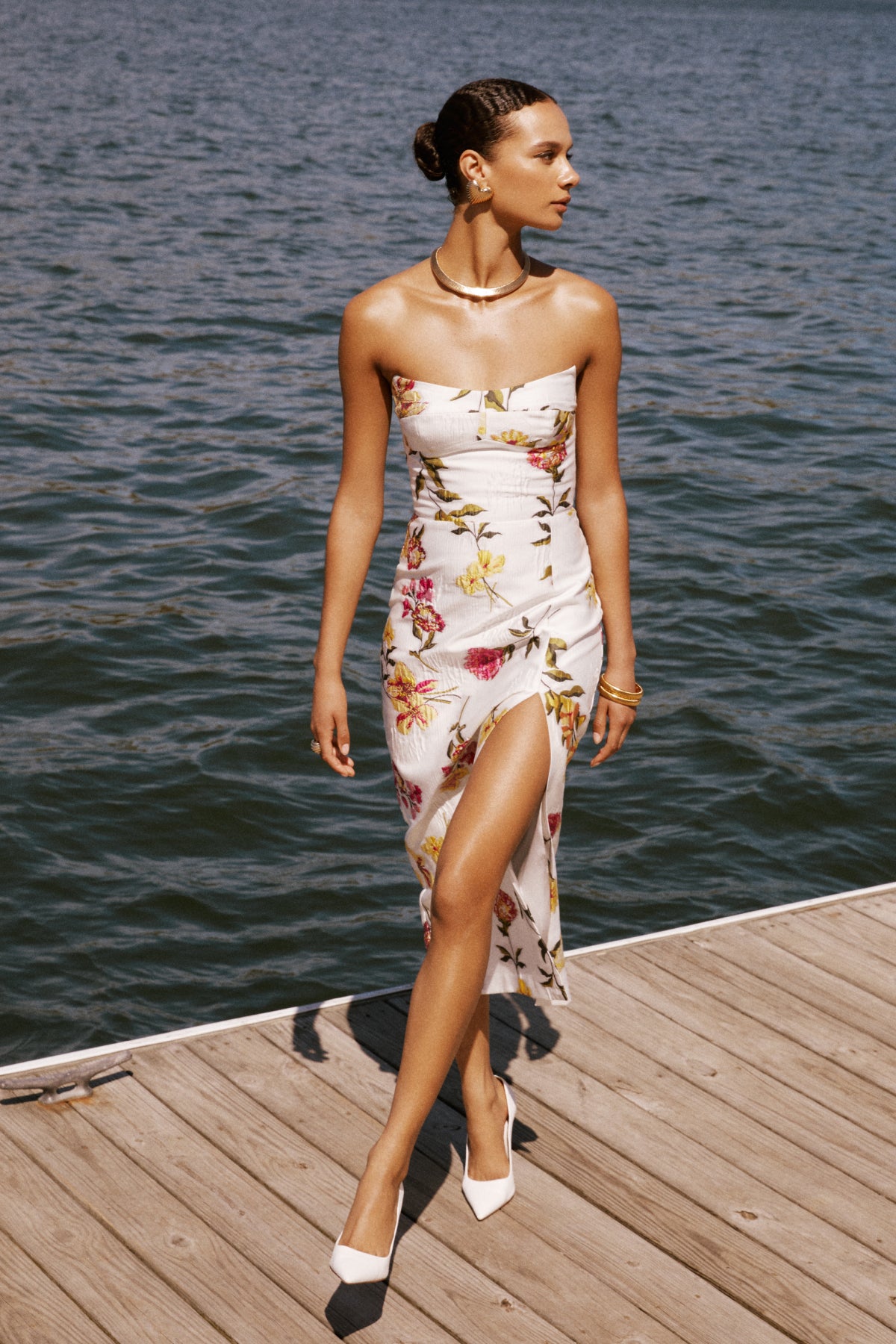 Catch eyes in the Ivy Dress. This strapless midi features a feminine print and a leg-baring slit that keeps things formal but fresh. Style with pink heels for a polished, charming look.